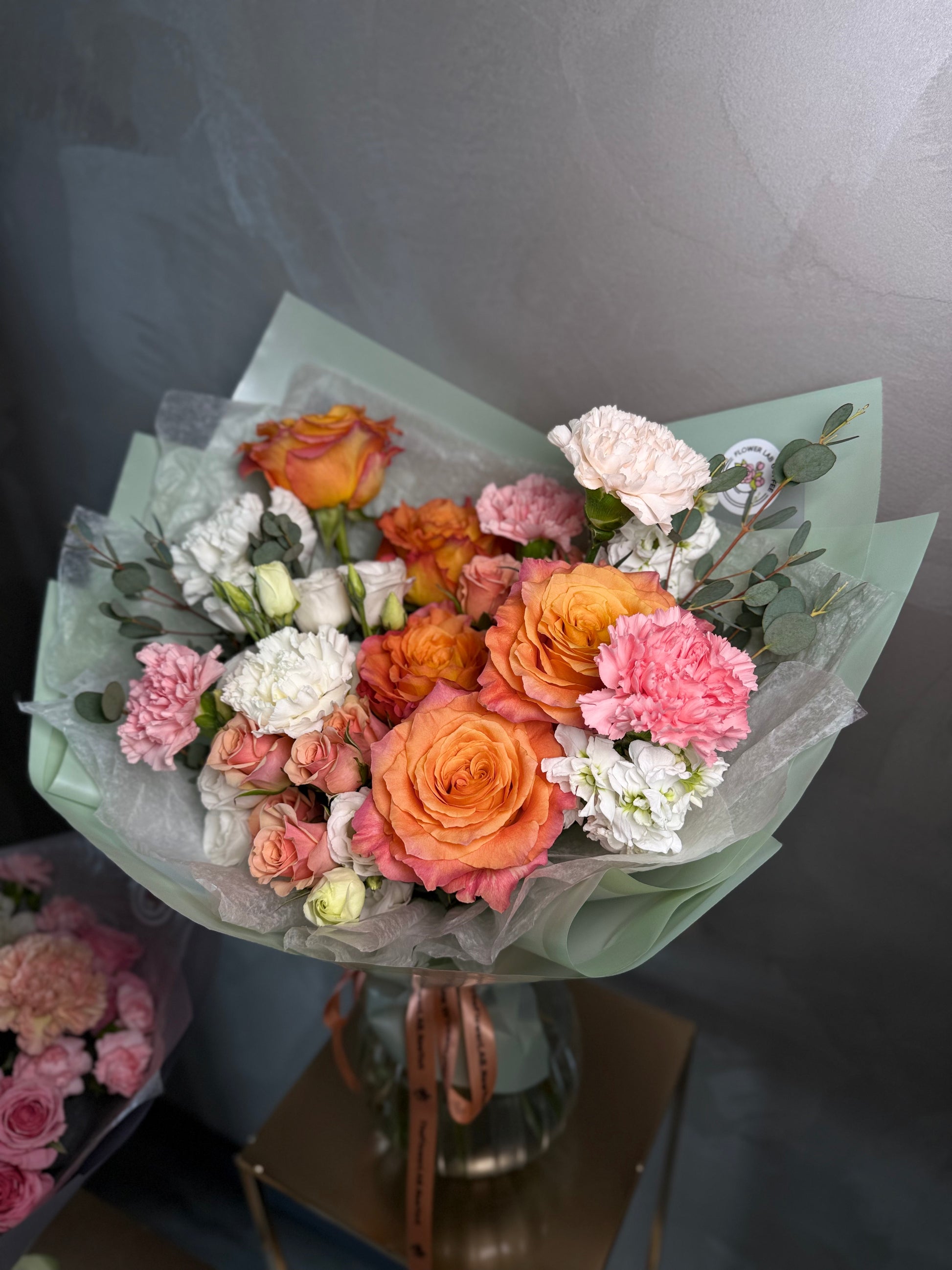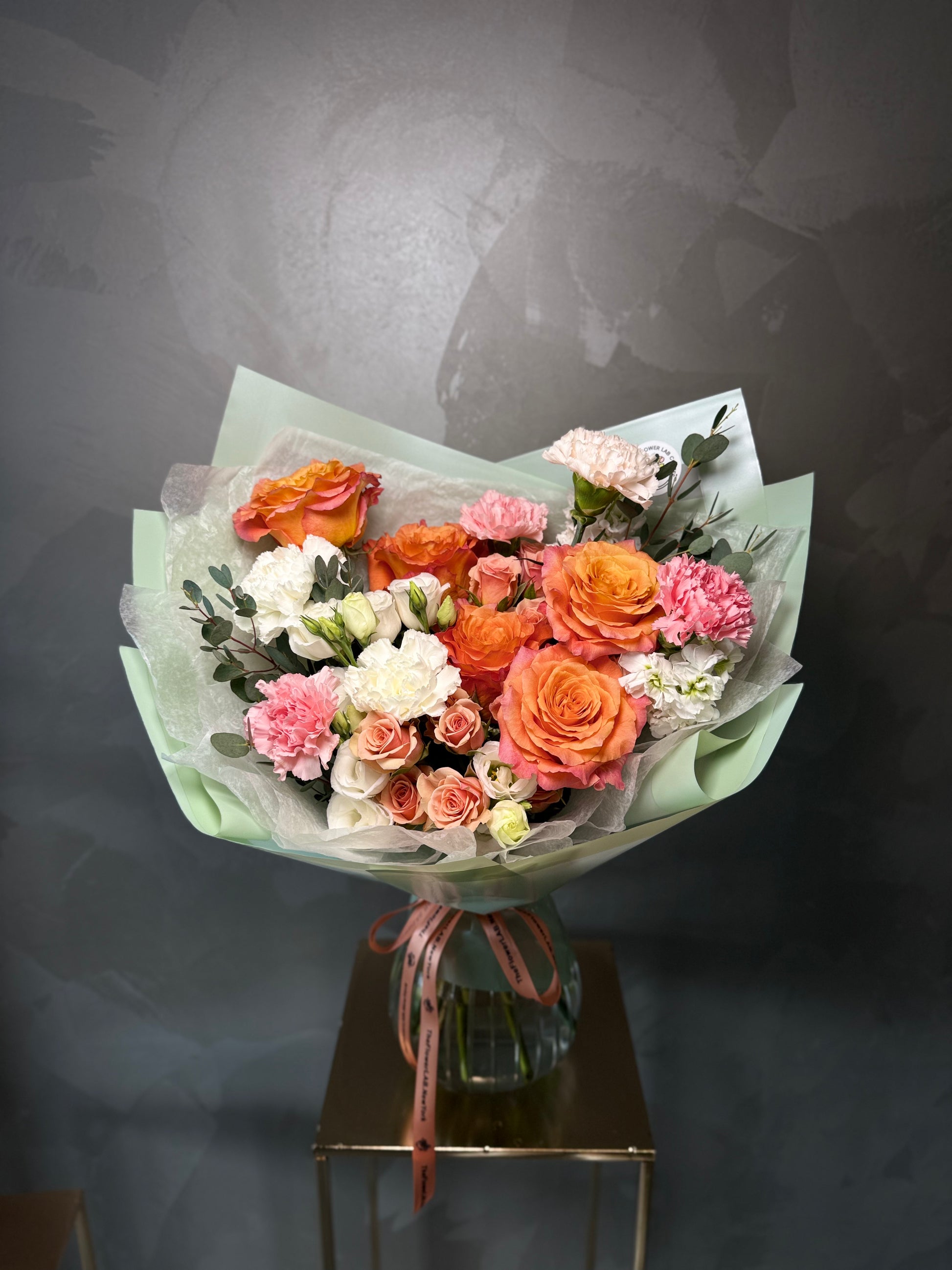 A warm and graceful arrangement inspired by the first days of fall. Featuring fiery orange dual-tone roses, soft peach spray roses, fragrant white stock, delicate lisianthus, and a blend of white and pink carnations. Accented with airy parvifolia eucalyptus, this bouquet radiates elegance and seasonal charm.