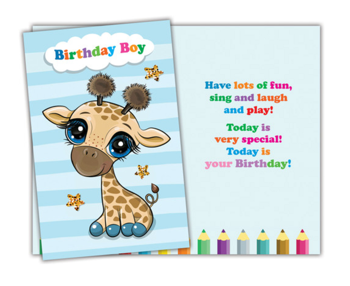 A fun and colorful birthday card for boys featuring a cute giraffe and a surprise coloring page inside. A playful keepsake that makes birthdays extra special.