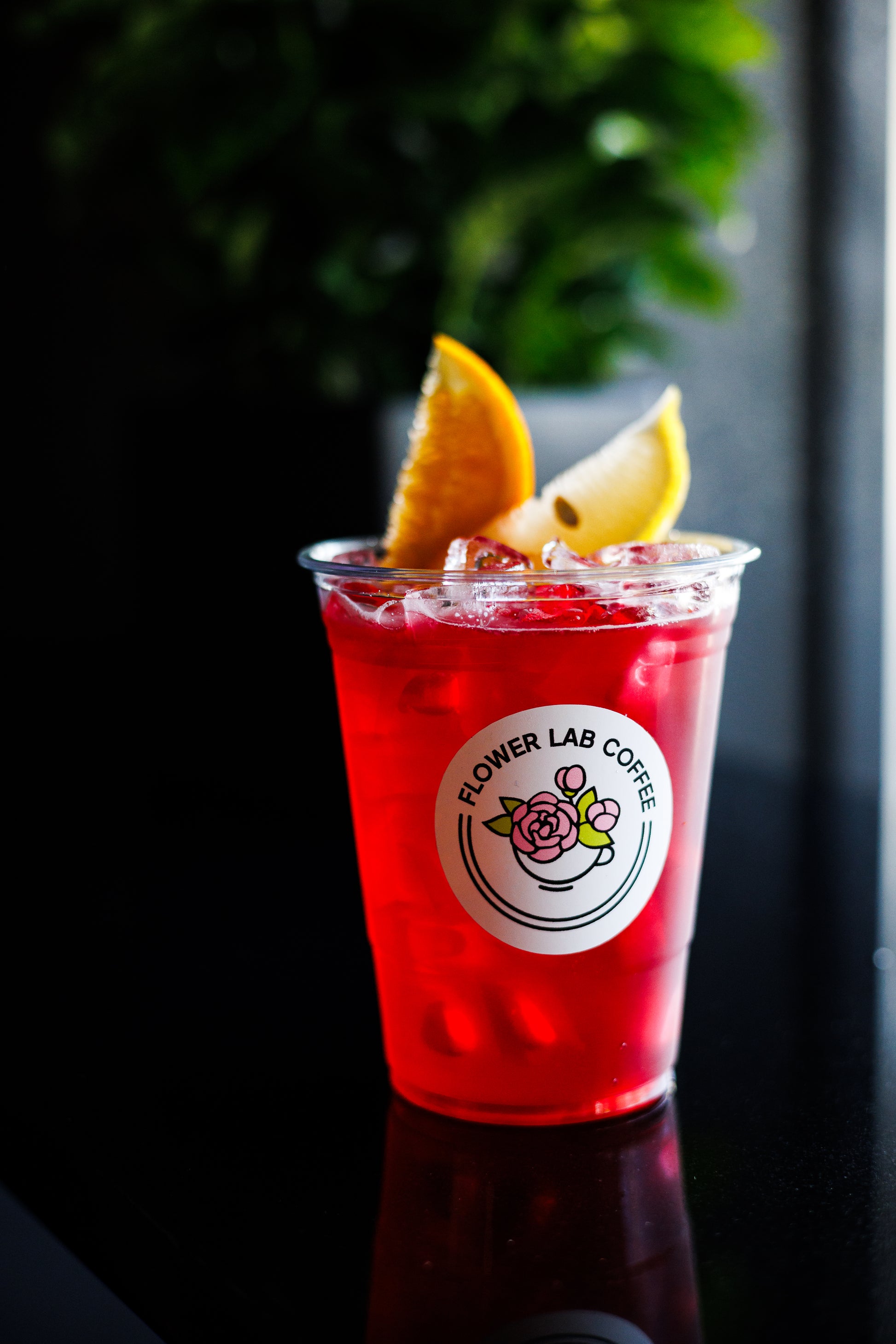 A bold, ruby-red herbal iced tea brewed from dried hibiscus petals, perfectly balanced with a splash of fresh lemon for a bright citrus twist.