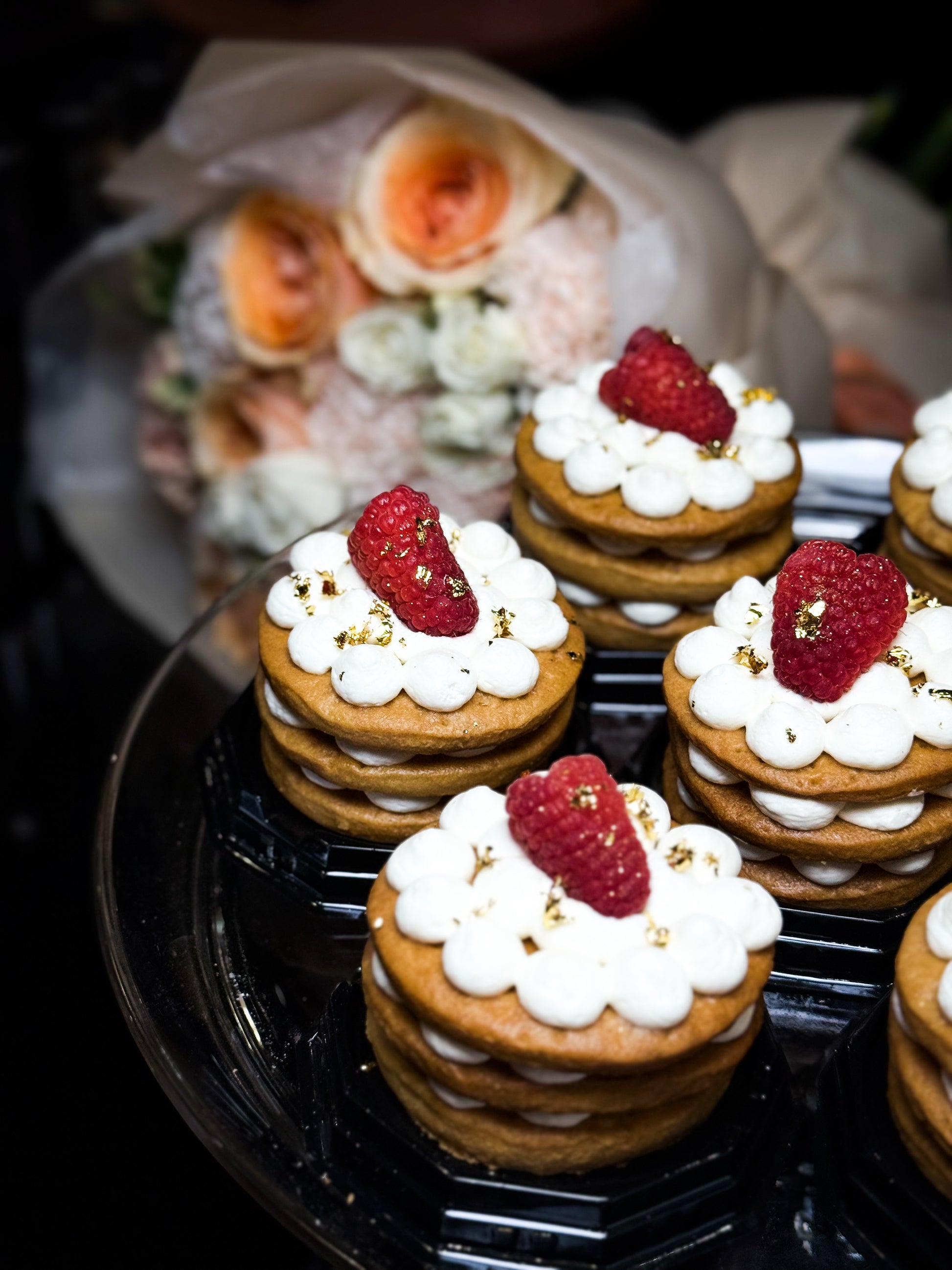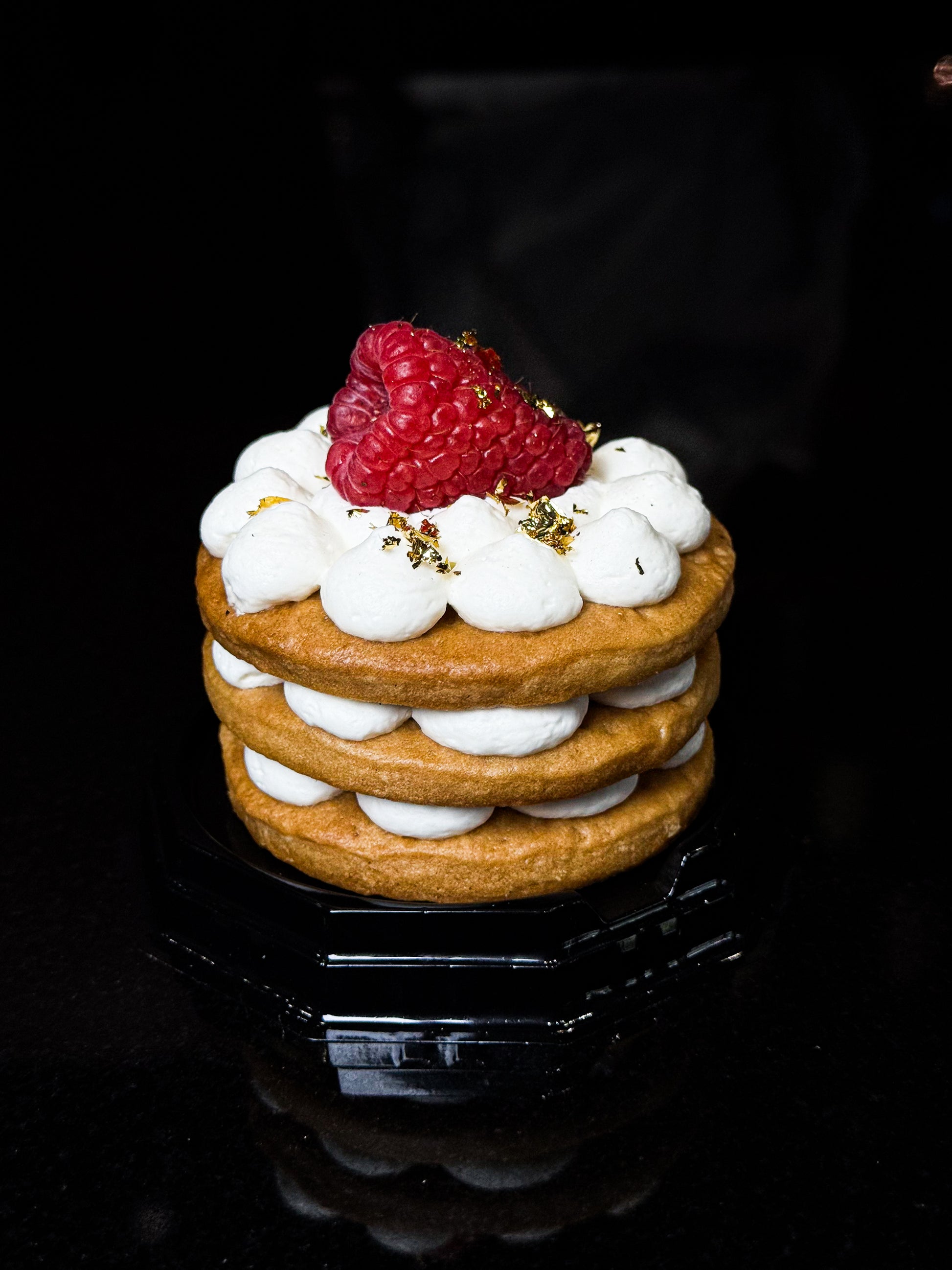 Topped with fresh raspberries and a touch of edible gold, this handcrafted dessert is both elegant and indulgent.