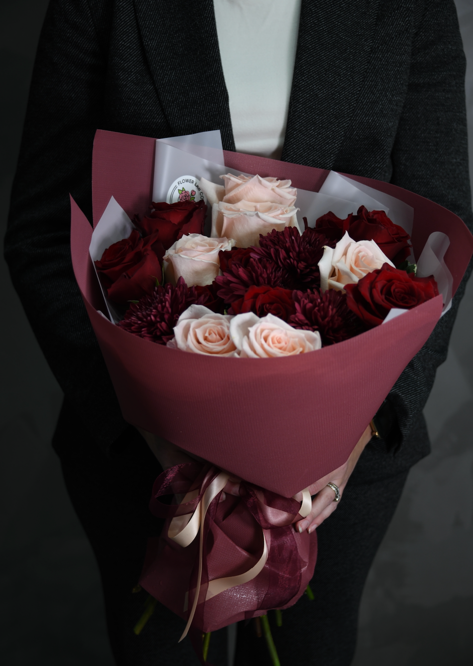 Love & Harmony Flower Bouquet is an elegant Valentine’s Day arrangement designed to express passion, warmth, and balance. This bouquet features premium-grade red roses paired with soft crème-peach roses, accented with deep burgundy chrysanthemums and fresh greenery.