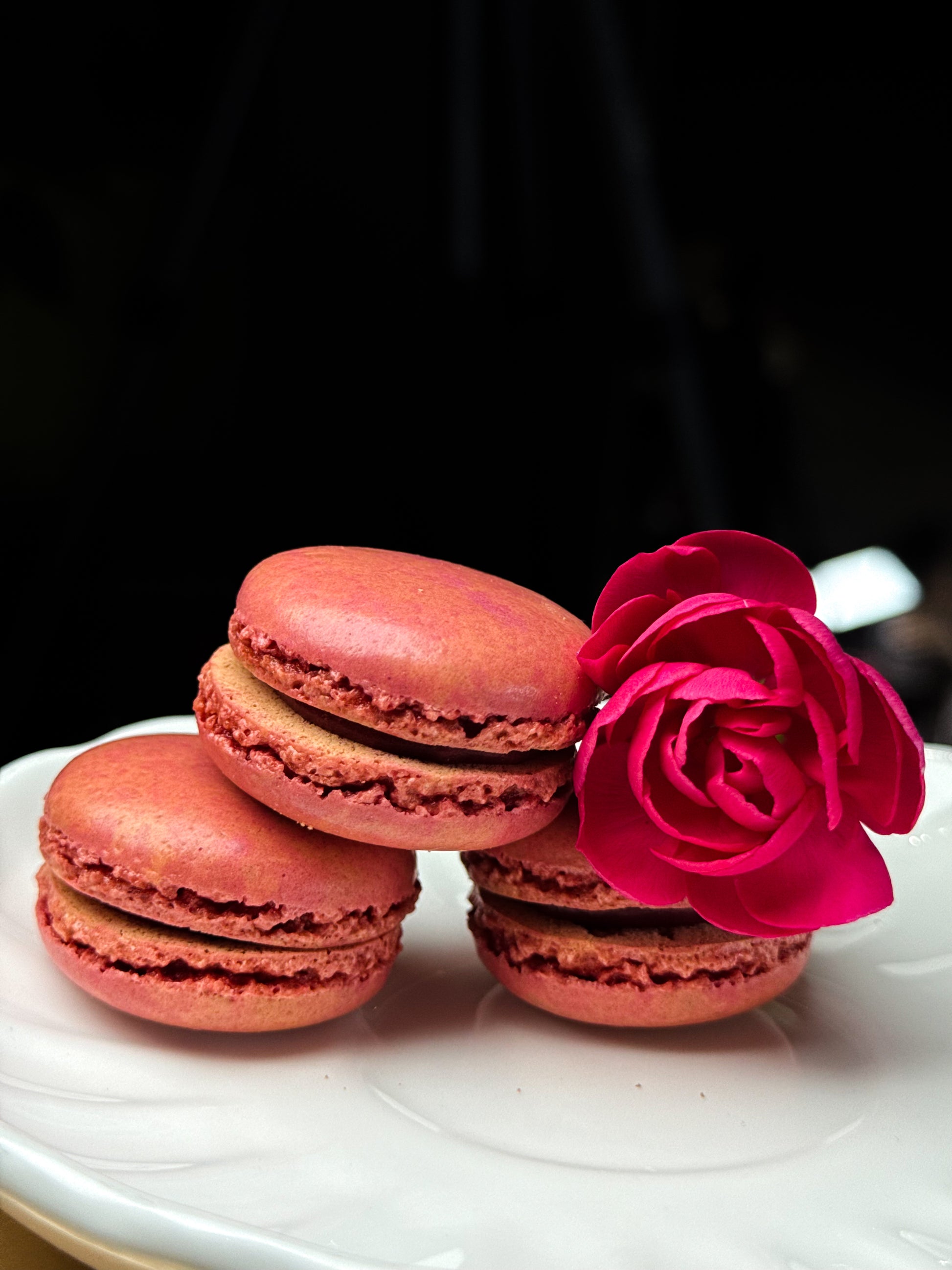 A delicate French macaron with a crisp shell and soft, chewy center, filled with luscious raspberry buttercream. The perfect balance of sweetness and tart berry flavor, handcrafted for the ultimate indulgence.